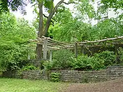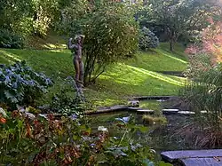 Am Fuss des an der Südseite des Hauses befindlichen Hanges ist ein Wasserbecken mit japanisierenden Trittsteinen platziert. Die zahlreichen Sitzplätze sind über eine Vielzahl asphaltierter, durch polygone Natursteinplatten eingefasste Wege zu erreichen. Die vielen Ruheorte fügen sich in die Topographie ein und ermöglichen je nach Lage einen Ausblick auf den Teich oder in die einzelnen Gartenpartien. Bruchsteinmauern und rustikale Tessiner Pergolen erstrecken sich über dem Wegenetz und dienen als Abschluss nach aussen.[2] Für die Bepflanzung unterteilte Ammann den Park in drei Bereiche. Um den Teich herum wählte er Bäume und Sträucher der Auenlandschaft, eine Waldgesellschaft für die schattigen Partien. An den geschützten und versteckten Orten pflanzte er eine südliche Vegetation mit winterharten Pflanzen aus dem Tessin oder solchen, deren äussere Erscheinung ihnen ähnlich war.