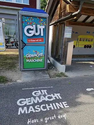 Die Gut-gemacht-Maschine lobt ihre Besucher für gute Taten. Sie ist eine umfunktionierte Telefonkabine im Ort Mettau in der Schweiz und würdigt laut Entwicklerteam bereits kleine Erfolge.[1] Seit dem Herbst 2020 richtet sich die Gut-gemacht-Maschine zum einen an Einheimische, zum anderen erfährt die Gemeinde verstärkten Besuch durch Touristen,[2] auch aus dem Ausland.[3][1] In ihrem ersten Quartal besuchten rund 150 Menschen diese Maschine – laut ihren Initianten ist sie die weltweit erste ihrer Art.[4]