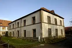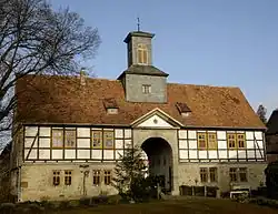 An der Nordseite des Anwesens, von der Straße aus nur teilweise sichtbar, steht das dreigeschossige Herrenhaus aus dem Jahre 1660 mit seinem roten Fachwerkgebälk. Der Bau wurde im 19. Jahrhundert erweitert. An beiden Enden wurde das giebelseitige Walmdach jeweils durch nicht ganz Firsthohe, von der Vorder- bis zur Rückfront durchgehende Zwerchhäuser mit verschieferten Giebeln komplementiert bzw. ersetzt, was den Eindruck von zwei rechtwinklig angebauten Seitenflügeln erweckt.