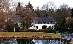 Das Gartenniveau steigt vom Gebäudetrakt entlang der Blickachse aus leicht an, ist im Vordergrund mit Kieswegen durchsetzt und wird betont durch den Springbrunnen im Mittelpunkt. Der Hintergrund wird bestimmt durch die waldähnliche Zusammensetzung mit dem Weiher am Kopf des Geländes. Dieser wurde in früheren Jahren über ein Bleirohr mit Wurmwasser gespeist, das von dort durch das Grundstück geleitet wurde, wo es unter anderem die Mühlenräder der Fabrik antreiben konnte, um anschließend wieder in dem Hauptverlauf der Wurm einzufließen.