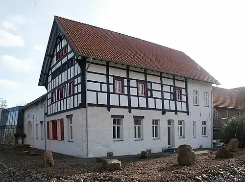 Kern der Anlage ist das 1661 erbaute Wohnhaus an der Nordost-Ecke. Sein Erdgeschoss mit Ziegelmauerwerk ist weiß gestrichen. Sein erstes Stockwerk und sein Dachgeschoss sind in Fachwerk ausgeführt und werden von einem Satteldach abgeschlossen. Hofseitig wurde dem Wohnhaus ein moderner, eingeschossiger Anbau vorgesetzt, sodass sich der einstige Haupteingang im heutigen Inneren des Hauses befindet. Dessen massiver, hölzerner Türsturz zeigt die geschnitzte Inschrift