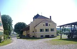 Es liegt an der östlichen Abbruchkante des Lechtals. Die beiden Schlösser des Gutes stehen unter Denkmalschutz, ebenso das Gutsverwalterhaus.