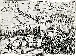 Im Zuge des Jülich-Klevischen Erbfolgestreits ließ Kaiser Rudolf II. das Rittergut am 25. März 1609[13] durch Erzherzog Leopold von Österreich, Bischof von Straßburg, und seine Söldner in Besitz nehmen. In der Folgezeit wurden dort kaiserliche Soldaten stationiert. Daraufhin rückte noch im selben Jahr der Gouverneur von Düren und pfälzische General Graf Friedrich zu Solms-Rödelheim mit über 1000 Mann und schweren Geschützen gegen Kalkofen vor,[17] belagerte es am Ende des Jahres und konnte es ohne viel Gegenwehr einnehmen.