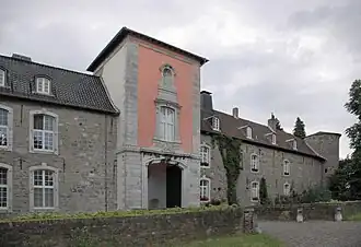 Zugang zur Anlage gewährt an dessen Südwest-Seite ein dreigeschossiger, aus der Mauerflucht vorspringender Torturm, zu dem eine zweibogige Steinbrücke führt. Sie wurde 1750 anstatt einer hölzernen Zugbrücke installiert.[6][7] Die Frontmauern des Turms bestehen aus graublauem Kalkstein für die Eckquaderungen und roten Ziegeln,[8] wobei Letztere mit einem rosa Anstrich versehen sind. Das seitliche Turmmauerwerk besteht, wie die Außenmauern des gesamten Südwest-Flügels, aus grob behauenen Grauwacke- und Kohlensandstein-Quadern.[9] Über dem Segmentbogen der Tordurchfahrt und damit auf der Sohlbank des Turmfensters findet sich das Allianzwappen Wespien-Schmitz und gibt einen Hinweis auf die Erbauer des Torbaus: den Aachener Bürgermeister Johann von Wespien und seine Frau Anna Maria Schmitz. Über dem Fenster findet sich eine heute leere Heiligennische. Die ursprüngliche, barocke Turmhaube mit Uhrengiebel und Laterne wurde nach dem Zweiten Weltkrieg durch ein flaches pfannengedecktes Pyramidendach ersetzt. Der hohe Torturm überragt den sonst nur zwei Geschosse umfassenden Südwest-Flügel des Guts. Dort waren früher die Pächterwohnung sowie Ställe zu finden. Die großen Stichbogenfenster des Flügels besitzen Gewände aus Blaustein und geben der Fassade eine gleichmäßige Aufteilung.