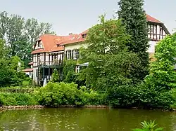 Der landschaftliche Gutspark verfügt über zwei Teiche und ist mit zahlreichen Rhododendron bepflanzt, zudem finden sich die Arten Urweltmammutbaum, Magnolie und Küsten-Tanne. Zur Ausstattung des Parks gehört auch ein Pumpenhäuschen aus Sandstein, steinerne Bänke, Tische, eine Brücke sowie ein mittlerweile verfallener Pavillon. Im Laufe des 20. Jahrhunderts wurden mehrere Skulpturen angeschafft und aufgestellt.[3]