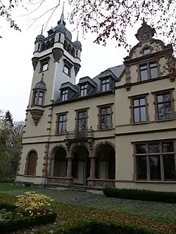 An der bevorzugten Südwestecke der Hofanlage liegt das Herrenhaus. Es wurde 1883–85 nach Entwürfen des Berliner Architekten Hans Grisebach errichtet. Das zweigeschossige Haus im Stil der Deutschen Renaissance (Neorenaissance) ist ein Putzbau mit Rotsandsteindetails und besitzt einen Turm an der Südwestecke. Die Hauptfassade richtet sich nach Süden; im Erdgeschoss öffnet sich eine Loggia mit drei Rundbögen, hinter der die zentrale Halle des Hauses liegt.