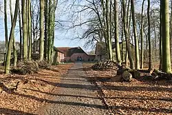 - der längeren westlichen axialen Hofzufahrt mit Kopfsteinpflasterung, teils als Allee durch ein Waldstück sowie teils symmetrisch zwischen zwei Schuppen,