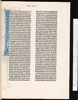 Die Gutenberg-Bibel, wegen der Anzahl von 42 Zeilen pro Seite auch „B42“ oder „B-42“ genannt, ist das erste mit beweglichen Lettern gedruckte Buch der westlichen Welt. Die lateinische Bibel entstand zwischen 1452 und 1454 in der Druckerwerkstatt von Johannes Gutenberg in Mainz. Mit Hilfe des Angestellten Peter Schöffer, des Geldgebers Johannes Fust und etwa 20 weiterer Mitarbeiter entstanden ca. 180 Exemplare. Neben den ca. 150 auf Papier gedruckten Bibeln gab es etwa 30 Ausgaben auf Pergament.[1] Die Gestaltung der Schrifttypen und des Drucks hält sich sehr eng an das Erscheinungsbild zeitgenössischer Handschriften.