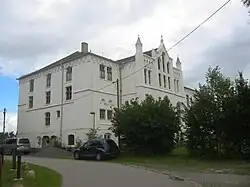 Der zweigeschossige Bau wurde zunächst mit identischen und symmetrisch angeordneten Fenstern im Erd- und Obergeschoss errichtet. Das erste Stockwerk war durch ein Gesims vom unteren Teil des Gebäudes optisch getrennt und vom Dach durch einen dreieckförmigen Fries abgegrenzt. Der mittlere Teil des Gebäudes trat aus dem Gebäude hervor und wurde durch Lisenen optisch weiter betont. Nach oben hin verlängern sie sich in zwei kleinen Türmen. Dazwischen befand sich ein Mittelrisalit, in dem eine Uhr eingelassen war. Der Umbau in den neugotischen Stil erfolgte unter anderem durch den Einbau der für die Gotik typischen Spitzbogenfenster. Die vier oberen Fenster wurden verkleinert und mit weiteren Spitzbögen umrahmt. Außerdem erfolgte der Anbau eines Erkers sowie eines zusätzlichen Vorbaus im Erdgeschoss, durch den die ursprünglich vorhandene Symmetrie des Gebäudes verloren ging. Bei der letzten Sanierung wurde dieser Vorbau wieder entfernt; der Erker blieb jedoch bestehen.
