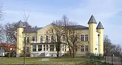 Der Aufbau des zweigeschossigen Herrenhauses folgt klassizistischen Vorbildern, zeigt in Einzelheiten jedoch bereits Formen der Neugotik: Tudorbögen über den Fenstern des ersten Stocks, Vierpässe in den Zierformen im Mittelrisaliten. Der Baukörper wird von vier Ecktürmchen mit Spitzhelmen flankiert. Der dreiachsige Mittelrisalit an der elfachsigen Hofseite besitzt einen Dreiecksgiebel mit Staffelfenstern. Dem Mittelrisaliten der dreizehnachsigen Parkseite wurde ein eingeschossiger Anbau mit Dachterrasse vorgesetzt.