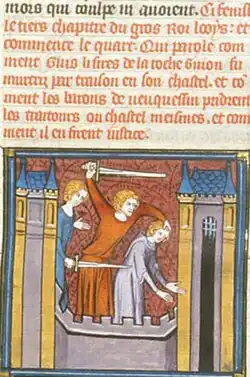 So berichtet es der Abt Suger von Saint-Denis in seiner Vita Ludovici grossi regis als Belehrung an seinen Freund und König Ludwig VI. dem Dicken. Mit diesem und dem gleichzeitig erfolgten Mord an den Grafen Karl von Flandern beabsichtigte Suger dem König den moralischen Zerfall des fränkischen Burg- und Lehnsadels aufzuzeigen, der in seiner tiefen Verkommenheit selbst vor Fehden im engsten Familienkreis nicht zurückschrecke. Dem entgegen erkannte Suger im Königtum die einzig legitime und Ordnung schaffende Macht an, da allein diese aufgrund ihrer direkt von Gott verliehenen Autorität zur Herrschaftsausübung und Rechtsprechung ermächtigt und befähigt sei.
