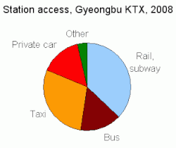 Auf der Kurzstreckenverbindung zwischen Seoul und Cheonan konnte KTX aufgrund der kurzen Entfernung und der Lage des KTX-Bahnhofs außerhalb der Stadt nur einen sehr bescheidenen Marktanteil gewinnen, was sich kaum auf den Gesamtanteil des Intercity-Zugverkehrs auswirkte.[1] Auf der Mittelstreckenverbindung von Seoul nach Daejeon gewann KTX vor allem auf Kosten der normalen Expressdienste auf der Gyeongbu Linie Marktanteile und trug dazu bei, den Gesamtanteil der Bahn auf ein Drittel zu erhöhen.[1] Auf den Fernstreckenverbindungen von Seoul nach Daegu und Busan eroberte KTX sowohl die Mehrheit des Marktes als auch den Großteil der Fahrgäste,[1] wodurch der Gesamtanteil der Bahn bis 2008 von etwa zwei Fünfteln auf zwei Drittel anstieg.[51]
