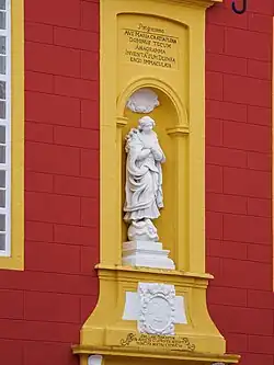 Das Zentrum der zweiten Ebene bildet eine Statue der unbefleckt empfangenen Gottesmutter, die die Schlange der Erbsünde zertritt; darüber das lateinische Anagramm:
