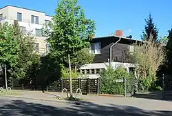 Das Haus besteht aus modernen Grundformen wie gestaffelten Kuben und liegenden Formeln und ist im Stil der Neuen Sachlichkeit gestaltet. Der auf der Gartenseite im spitzen Winkel aus der Wandfläche hervortretende Standerker und das ursprünglich nach oben spitz zulaufenden Einfriedungstor weist expressionistische Formen auf. Wegen des moorastigen Untergrunds steht das Haus auf einem Pfahlrost mit einer Rostplatte aus Eisenbeton. Um das Gewicht des Gebäudes zu reduzieren, wurde das zweigeschossige Wohnhaus und die eingeschossige Turnhalle in Fachwerkbauweise mit einer Ausfachung aus leichtem Schwemmstein konstruiert.[6] Die Außenwände sind hell verputzt und am Obergeschoss des Wohnhauses mit einer dunkelbraun gestrichenen Stülpschalung verblendet. Ein horizontales Fensterband belichtete den Umkleideraum und den angrenzenden Duschraum im Erdgeschoss des Wohnhauses. Die Belichtung der Turnhalle erfolgte über horizontale Fensterbänder im Dachbereich und drei doppelflügelige Fenstertüren auf der Gartenseite. Die Räume wurden in den 1980er-Jahren für Wohnzwecke umgenutzt.