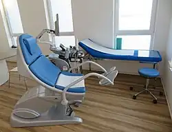 Gynäkologische Stühle gibt es in vielen verschiedenen Ausführungen. Anspruchsvollere Modelle bieten u. a. die Möglichkeit, die Höhe und die Neigung der Sitzfläche und der Rückenlehne motorisch zu verstellen, um die Untersuchung zu erleichtern.