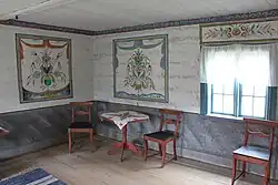 Der Hausschmuck zeigt sich beispielsweise in profilierten Dachfüßen, geschnitztem oder profilgesägtem Fensterfutter sowie kunstvoll gestalteten Hauseingängen. Die Interieurs sind teilweise gut erhalten mit Wandgemälden, Schablonegemälden und Tapeten. Die Bilder zeigen biblische Motive, ins Hälsingemilieu übertragen, aber auch lustige Erzählungen, gemischt mit Kurbitsmalereien mit Blumen und Bändern.