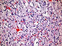 Histologisch handelt es sich um einen äußerst gefäßreichen Tumor. Beim häufigeren retikulären Subtyp sieht man zwischen dicht gepackten kapillären Blutgefäßen einzelne im Tumorstroma gelegene größere Zellen mit hellen oder klaren, häufig vakuolisierten Zytoplasmen, die als Stromazellen bezeichnet werden, deren Histogenese ungeklärt bleibt. Seltener ist der bereits von Harvey Williams Cushing und Percival Bailey beschriebene zelluläre Subtyp, in dem die Stromazellen in Zellballen zusammengefasst werden und dessen histologisches Bild an das von Paragangliomen erinnert.[1] Bei der differenzialdiagnostisch wichtigen Abgrenzung gegenüber Metastasen von Nierenzellkarzinomen (die bei Patienten mit Von-Hippel-Lindau-Syndrom ebenfalls gehäuft auftreten) kann immunhistochemisch insbesondere die fehlende Färbung der Stromazellen für das epitheliale Membranantigen (EMA) und der Nachweis einer niedrigen proliferativen Aktivität in der Färbung für Ki67/MIB-1 hilfreich sein.[2][3]