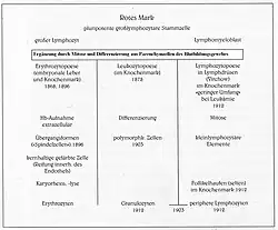 Dieser Meinung schlossen sich die Unitarier Alexander A. Maximow (1874–1928) („Großer Lymphozyt“ als „Stammzelle“ – 1. Juni 1909 Sitzung der Berliner Hämatologischen Gesellschaft, S. 297) aus St. Petersburg, Max Askanazy, Königsberg und Genf, Franz Weidenreich (1873–1948), Wera Dantschakoff-Grigorewski (geb. 1879), Ernst Grawitz (1860–1911), Hans Hirschfeld (1873–1944) an, sowie Artur Pappenheim (1870–1916), letzterer in der von ihm und Grawitz 1908 gegründeten „Berliner Hämatologischen Gesellschaft“ (1908). Des Weiteren sind zu nennen S. Mollier, Adolfo Ferrata (1880–1946) und Georg Eduard von Rindfleisch (1836–1908). Im Meinungsstreit um die Hämatopoetische Stammzelle setzten sich jedoch die Dualisten durch: „Eine einmal in der Embryonalzeit angelegte Stammzelle differenziert sich nach der Geburt in mehrere verschiedene Blutzellreihen.“ Durchsetzungsfähigster Dualist war der Nobelpreisträger Paul Ehrlich (1854–1915) neben Wilhelm Türk (1871–1916) aus Wien und Otto Naegeli (1871–1938) aus der Schweiz. Dessen Werk Blutkrankheiten und Blutdiagnostik 2. Aufl. 1912, wurde zum Standardwerk im deutschsprachigen Raum. Hier geht Naegeli mit den Unitariern „streng ins Gericht“.[9] Der Dualistische Standpunkt Paul Ehrlichs zu mehreren embryonalen Stammzellen ist in der Abbildung wiedergegeben.