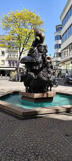 Der Brunnen besteht aus einem sechseckigen Sockel aus rotem Basalt, auf dem eine Bronzeskulptur steht, umgeben von einem ebenfalls sechseckigen Wasserbecken. Die Skulptur, die 1981–1982 vom luxemburgischen Bildhauer Wil Lofy geschaffen wurde, stellt den Hämmelsmarsch dar, einen traditionellen Umzug zur Kirmes. Zu sehen sind vier Musiker, fünf Schafe und zwei Kinder; der Künstler hat sich selbst als Akkordeonspieler porträtiert. Aus den Instrumenten fließt Wasser in das Brunnenbecken.[1]
