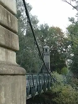 Während des Zweiten Weltkriegs wurde die Brücke am Heiligen Abend des Jahres 1944 bei Fliegerangriffen beschädigt. Insgesamt 110 Sprengbomben gingen auf die Hängebrücke und die benachbarte Eisenbahnbrücke nieder, deren Splitter an der Hängebrücke nur leichte Schäden an den Kabeln verursachten. Die aufgerissenen Stellen wurden später mit den heute noch sichtbaren Manschetten repariert.