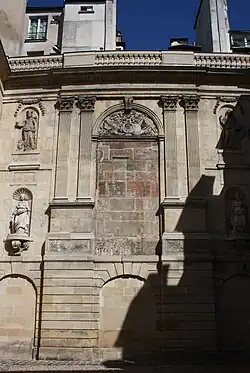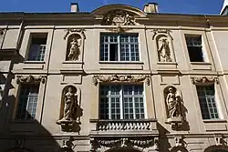 Das Eingangsportal wurde von dem Bildhauer Thomas Regnaudin (1622–1706) gestaltet. Auf dem Tympanon sind zwei sitzende Famen dargestellt, auf den beiden Türflügeln zwei Medusenhäupter, darüber Engel mit Wappenkartuschen und von Medaillons umrahmte allegorische Figuren. Das Tympanon der Innenseite des Portals stellt dar, wie der Hirte Faustulus die Zwillinge Romulus und Remus auffindet, die von einer Wölfin gesäugt werden. Auch die Innenseiten der Türflügel sind mit Reliefs allegorischer Figuren verziert.