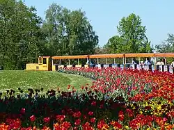 Anlässlich der Deutschen Gartenschau von 1950 entstand im Höhenpark Killesberg eine 820 Meter lange Sesselbahn.[10] Die als Einseilumlaufbahn konzipierte Seilbahn verkehrte vom Bereich des heutigen Fontänensees unterhalb des Haupteingangs über das Tal der Rosen bis zum damaligen Blindensee oberhalb der Steinbruchreste beim Ausflugslokal Weigelschmid. Der Fahrbetrieb fand in den Monaten April bis Oktober statt.[11]