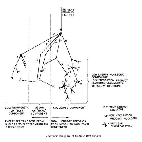 Durch Spallation von Stickstoff- und Sauerstoffatomen entstehen Neutronen, Protonen, geladene (π+, π−), und neutrale (π0) Pionen. Die neutralen Pionen zerstrahlen in zwei Gammastrahlen, die geladenen zerfallen in Myonen und Neutrinos: