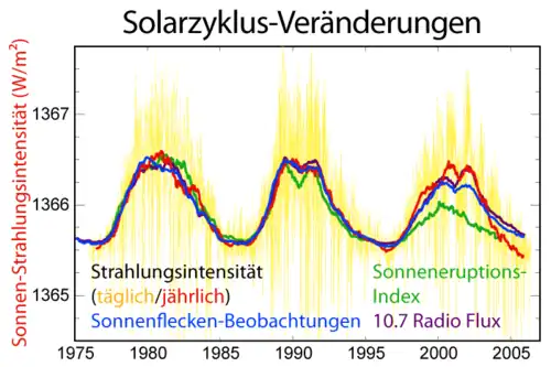 - ↑ Robert E. Dickinson: Solar variability and the lower atmosphere. In: Bulletin of the American Meteorological Society PDF 815 kB, 12/1975, Bd. 56, Ausgabe 12, S. 1240–1248, doi:10.1175/1520-0477(1975)056<1240:SVATLA>2.0.CO;2