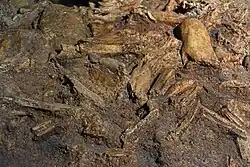In Höhlen, die regelmäßig von Höhlenhyänen aufgesucht wurden, findet man neben den Resten von Menschen und Höhlenbären, die Höhlen ebenfalls häufig als Unterschlupf aufsuchten, zahlreiche eiszeitliche Tiere, die als Nahrung herbeigeschleppt wurden. In Hyänenhöhlen Mitteleuropas findet man etwa Knochen von Wollhaarmammut, Wollnashorn, Wildpferd, Halbesel, Steppenbison, Steinbock, Gämse, Riesenhirsch, Rothirsch, Rentier, Wolf, Vielfraß und Höhlenlöwe, die von den Höhlenhyänen aufgebrochen oder angebissen wurden. Funde von jungen Hyänen belegen, dass die Höhlen auch für die Jungenaufzucht genutzt wurden. Neben echten Höhlen dienten vielerorts auch Bauten oder Cluzeaus[3] in offenem Gelände als Unterschlupf. Derartige Hyänenhorste außerhalb von Höhlen kennt man etwa aus Bad Wildungen. Ähnlich wie heute in den afrikanischen Savannen waren Löwen und Hyänen auch im eiszeitlichen Mitteleuropa sowohl Nahrungskonkurrenten als auch Fressfeinde. Das große Höhlenlöwenmännchen von Siegsdorf, das neben einem Mammutkadaver gefunden wurde, wurde möglicherweise das Opfer eines Hyänenclans.[4]