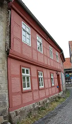 Das zweigeschossige Fachwerkhaus stammt aus der Zeit um 1760. Die Fachwerkfassade ist mit profilierten Bohlen versehen. In den Gefachen finden sich Zierausmauerungen. Die Hausflucht folgt dem hier gebogenen Verlauf der Straße. Im 19. Jahrhundert erfolgte eine Erneuerung des Gebäudes.