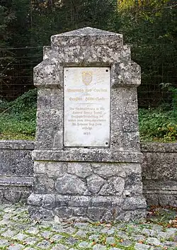 Nächst der Höllental Straße (B27) befindet sich ein Inschriftpfeiler. Er trägt das Wiener Wappen und die Inschrift: