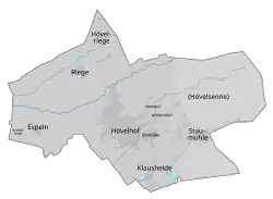 Historisch bedingt gliedert sich die Gemeinde Hövelhof in die Ortsteile Hövelhof, Klausheide, Staumühle, Espeln, Riege, Hövelriege und Hövelsenne. Die Hauptsatzung der Gemeinde unterscheidet diese Ortsteile jedoch nicht. Des Weiteren gibt es noch die Ortslagen Bentlake, Untersenne und Hasendorf östlich des Ortskerns. Im Zuge der Erweiterung des Truppenübungsplatzes Senne musste fast der gesamte erst ab Mitte des 17. Jahrhunderts in Form von Riegen (Reihendorf) entstandene, im Osten von Hövelhof gelegene Ortsteil Hövelsenne ab 1939 geräumt werden. Einschließlich der aus dem Jahr 1800 stammenden Schule (1966) und der erst 1923 errichteten St. Josefskirche (1974) mussten 135 Häuser und Höfe geräumt werden.[6]