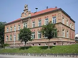 - Neben dem klassizistischen Schulhaus der Volksschule von 1895/96 mit seiner Backsteinfassade besteht auch noch das 1848 erbaute evangelische Schulhaus.