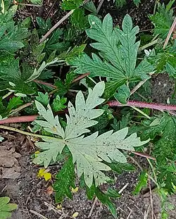 Die grundständigen und wechselständig verteilt am Stängel angeordneten Laubblätter sind in Blattstiel und Blattspreite gegliedert. Die gefingerte[3] Blattspreite besteht aus meist fünf spatelförmigen Teilblättern[4]. Der Blattrand ist nicht umgerollt und besitzt jederseits meist zwei bis drei, selten vier tief eingeschnittene Zähne, der Endzahn ist meist kürzer als die seitlichen Zähne.[1][4] Die Blattoberseite ist locker kurz behaart und die Blattunterseite ist weißgrau-filzig behaart[1].[5]