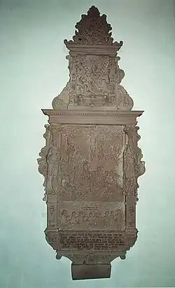 In den Gemündener Pfarrbüchern ist 1598 die Heirat des Jodocus Hügel eingetragen. Das monumentale Epitaph von 1601 in der Pfarrkirche St. Peter und Paul berichtet von Simon Hügel. Es waren wohlhabende Leute, denn eine solche Grabplatte in der Kirche, die von allen gesehen wurde, bedeutete ein großzügiger Stifter zu sein.[1]