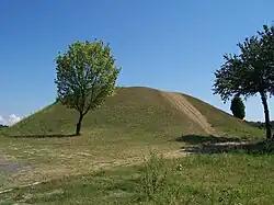 Der Leeberg bei Großmugl mit rund 14 m Höhe und etwa 50 m Durchmesser (Hallstattzeit)