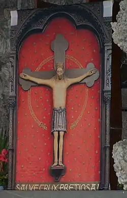 Das Kreuz stammt vermutlich aus dem 11. Jahrhundert,[1] genaue Angaben zur Herkunft sind nicht bekannt. Einer Sage nach soll es ein Ritter aus dem Heiligen Land mitgebracht haben. Wann es im 14. Jahrhundert auf den Hülfensberg kam, ist ebenfalls nicht genau bekannt. Das Kreuz wurde aber schnell ein Ziel von Wallfahrern nicht nur aus der Umgebung des Hülfensberges, sondern auch aus Norddeutschland. Mit den Wallfahrten zum Sankt Gehilfen änderte sich auch der Name des ursprünglich Stuffenberg genannten Berges, im 14. Jahrhundert wird Gehülfensberg gebräuchlich, verkürzt später dann Hülfensberg.[2] Im 15. oder 16. Jahrhundert wurde das Kreuz durch ein Feuer beschädigt. Nachdem das Kreuz 1837 sogar aus der Kirche entfernt worden war, erfolgte in den Jahren nach 1850 eine Restaurierung und Wiederherstellung der beschädigten Teile.