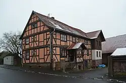 Der zweigeschossige giebelständige Satteldachbau besitzt ein regelmäßiges Fachwerkgefüge mit Mannfiguren an Bund- und Eckständer sowie eine profilierte Gebälkzone.