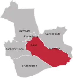Die Gemeinde Hünxe hat eine Gesamtfläche von 106,80 km². Sie gliedert sich in die sechs Ortsteile Hünxe (5484 Einwohner), Bruckhausen (4024 Einwohner), Bucholtwelmen (461 Einwohner), Drevenack (3413 Einwohner), Gartrop-Bühl (656 Einwohner) und Krudenburg (307 Einwohner).[2]