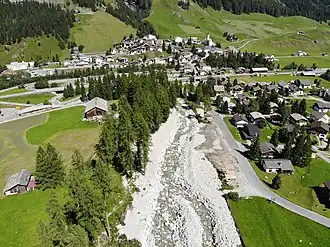 ![]() Der Hüscherabach vor der Einmündung in den Hinterrhein. Im Hintergrund das Dorf Splügen. | ||