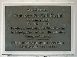 Geburtshaus von Professor Dr. Carl Riedel * 6. Oktober 1827 † 3. Juni 1888 Begründer und Leiter des Riedelvereins in Leipzig, einer später weltberühmten Chorgemeinschaft Präsident des Allgemeinen Deutschen Musikvereins 1868–1888 |
