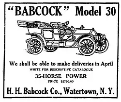 Henry Holmes Babcock (1821–1903) kam aus Hamilton (New York) nach Watertown. 1841 heiratete er Eliza Wheeler († 1900). Aus dieser Ehe gingen vier Söhne und zwei Töchter hervor.[1] 1845 begann er mit der Herstellung der Watertown Wind Mill, einer mit Wind betriebenen, hölzernen Wasserpumpe für landwirtschaftliche Anwendungen, die er auch beim Kunden installierte. Auch das Zubehör, insbesondere Zylinder, Tanks und hölzerne Wasserleitungen, baute er selber. Als eiserne Pumpen die hölzernen verdrängten verlegte sich Babcock in den frühen 1870er Jahren auf den Kutschenbau. 1878 nahm er seine Söhne George H., F.W., F.E. und Herbert P. in den Betrieb auf der nun H.H. Babcock & Sons hieß.[1]