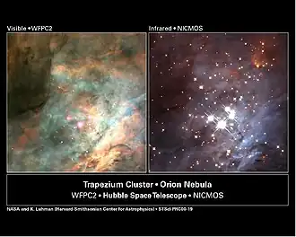 Der Orionnebel ist im optischen Spektrum als eine Gas- und Staubwolke zu sehen. Das Infrarotbild rechts zeigt die darin entstandenen Sterne.