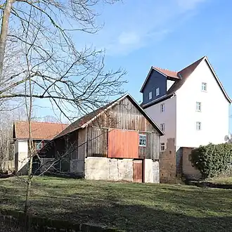 - Haus Nr. 13: Eingeschossiger Satteldachbau aus Sandsteinquadern, der Türsturz am Scheitelstein ist mit „J.J.B.H. / F.A.M.M. 1823“ bezeichnet.[10]