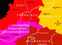 - ↑ Jakob: Dialekt und Regionalsprache im Raum Heilbronn … Teil 2: Kartenband, Karte 2 [Gebietsgliederung der Mundarten im Untersuchungsgebiet]