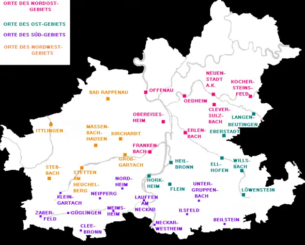 - Nordost-Gebiet: Cleversulzbach, Kochersteinsfeld, Neuenstadt am Kocher, Oedheim, Offenau, Obersulm, Erlenbach und Frankenbach.