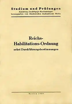 Für die Hochschulen des Deutschen Reiches wurden mit Runderlass vom 13. Dezember 1934 einheitliche Bestimmungen für die Habilitation und den Erwerb der Lehrbefugnis erlassen.[12] Der durch die politischen Entwicklungen entstandene Mangel an Hochschullehrernachwuchs und weitere Gründe führten 1939 zu einer Neufassung der Reichs-Habilitations-Ordnung. Diese regelte ein abgekürztes Verfahren und eine wirtschaftliche Sicherstellung des Hochschullehrernachwuchses dadurch, dass die Dozenten fortan mit der Verleihung der Lehrbefugnis in das Beamtenverhältnis berufen wurden, d. h. außerplanmäßige Beamte auf Widerruf wurden.[13]