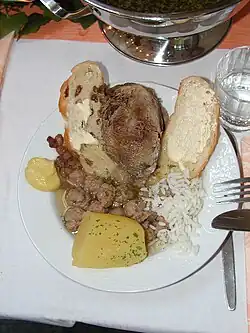 Die Suppenschüsseln und das aufgeschnittene Fleisch werden von den Kellnern in einer Art Prozession in den Festsaal getragen. Danach wird das Fleisch in der Regel auf dem Teller klein zerschnitten. Man gibt separat gekochten Reis (teilweise mit Rosinen) und Petersilie, dazu und übergießt das Ganze mit der Suppe. Manche essen das Fleisch, mit Salzkartoffeln und Senfsauce, jedoch getrennt vor oder nach der Suppe. Das wird von Dorf zu Dorf verschieden gehandhabt. Begleitet wird das Essen mit gebuttertem Stuten (süßes Weißbrot) oder von Rosinenstuten und klarem Kornbrand. Welches der beiden Brote gereicht wird, ist davon abhängig, ob die Rosinen bereits beim Reis dabei sind oder nicht.