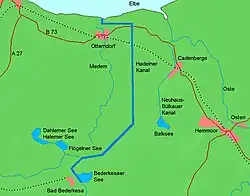 Auf der Rückseite des Hadelner Elbdeichs verläuft der Kanal westwärts und wird durch die Hadelner Kanalschleuse außendeichs geleitet. Noch auf der Deichrückseite gibt es eine „Durchstich“ genannte Querverbindung zur Medem. Sie ermöglicht es, bei starkem Anfall von Oberflächenwasser das Schöpfwerk Otterndorf zur Entwässerung des Kanals zu nutzen, vorrangig die östliche von dessen beiden völlig voneinander getrennten Anlagen, das heute elektrisch betriebene sogenannte „Dieselschöpfwerk“.