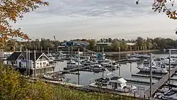 | 853,8 R | Marina ⊙ | Sportboothafen | Steganlagen | 350 Wasserliegeplätze für Kleinfahrzeuge bis 15 m Länge und kleine Schiffe bis 40 m und 1,6 m Tiefgang, Kran, Slipstelle Strom, Wasser, Sanitär, Clubhaus, Wohnmobil-Stellplatz, Trockenliegeplätze, ÖPNV[1] |